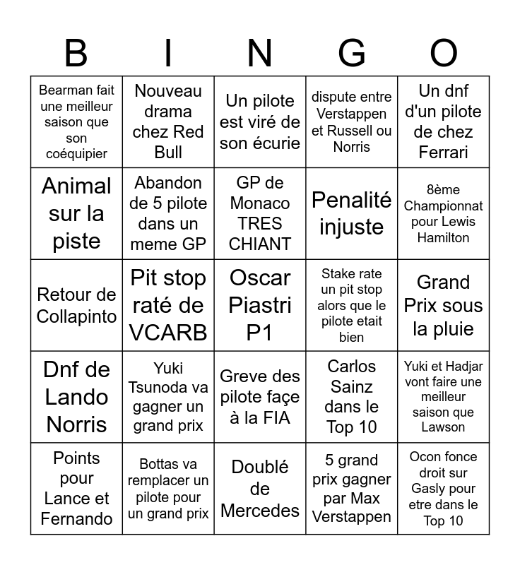 This bingo card has a free space and 24 words: Yuki Tsunoda va gagner un grand prix, Bottas va remplacer un pilote pour un grand prix, GP de Monaco TRES CHIANT, Points pour Lance et Fernando, Un dnf d'un pilote de chez Ferrari, Bearman fait une meilleur saison que son coéquipier, Animal sur la piste, Nouveau drama chez Red Bull, Stake rate un pit stop alors que le pilote etait bien, Greve des pilote façe à la FIA, Penalité injuste, Retour de Collapinto, Carlos Sainz dans le Top 10, Yuki et Hadjar vont faire une meilleur saison que Lawson, Abandon de 5 pilote dans un meme GP, 5 grand prix gagner par Max Verstappen, Grand Prix sous la pluie, Un pilote est viré de son écurie, 8ème Championnat pour Lewis Hamilton, Pit stop raté de VCARB, Ocon fonce droit sur Gasly pour etre dans le Top 10, Dnf de Lando Norris, dispute entre Verstappen et Russell ou Norris and Doublé de Mercedes.