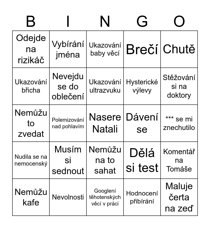 This bingo card has a free space and 24 words: Musím si sednout, Nevolnosti, Ukazování ultrazvuku, Nemůžu kafe, Chutě, Odejde na rizikáč, Ukazování břicha, Vybírání jména, Dávení se, Nemůžu na to sahat, Hysterické výlevy, Nemůžu to zvedat, Dělá si test, Komentář na Tomáše, Nevejdu se do oblečení, Hodnocení přibírání, *** se mi znechutilo, Ukazování baby věcí, Stěžování si na doktory, Polemizování nad pohlavím, Maluje čerta na zeď, Nudila se na nemocenský, Brečí and Googlení těhotenských věcí v práci.
