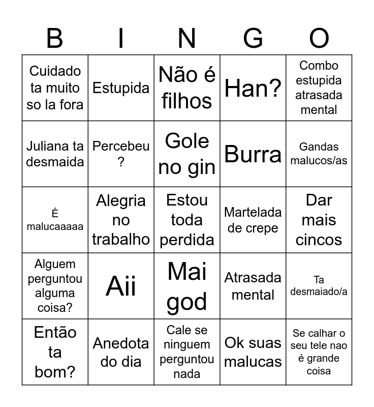 This bingo card has a free space and 24 words: Aii, Anedota do dia, Gole no gin, Então ta bom?, Combo estupida atrasada mental, Cuidado ta muito so la fora, Juliana ta desmaida, Estupida, Martelada de crepe, Mai god, Burra, É malucaaaaa, Atrasada mental, Ta desmaiado/a, Percebeu ?, Ok suas malucas, Dar mais cincos, Não é filhos, Gandas malucos/as, Alegria no trabalho, Se calhar o seu tele nao é grande coisa, Alguem perguntou alguma coisa?, Han? and Cale se ninguem perguntou nada.