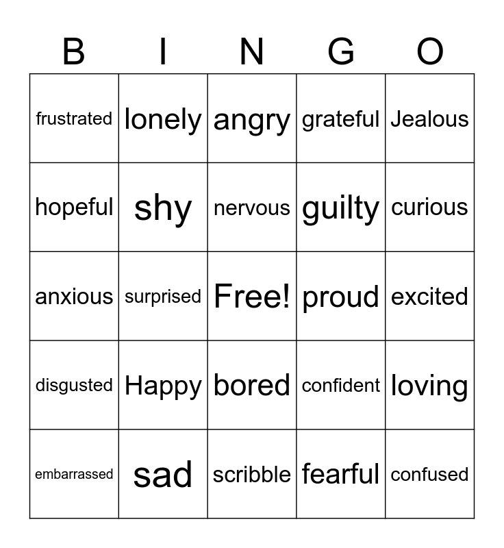 This bingo card has a free space and 24 words: Happy, sad, nervous, embarrassed, Jealous, frustrated, hopeful, lonely, proud, bored, guilty, anxious, confident, loving, shy, fearful, excited, angry, curious, surprised, confused, disgusted, grateful and scribble.