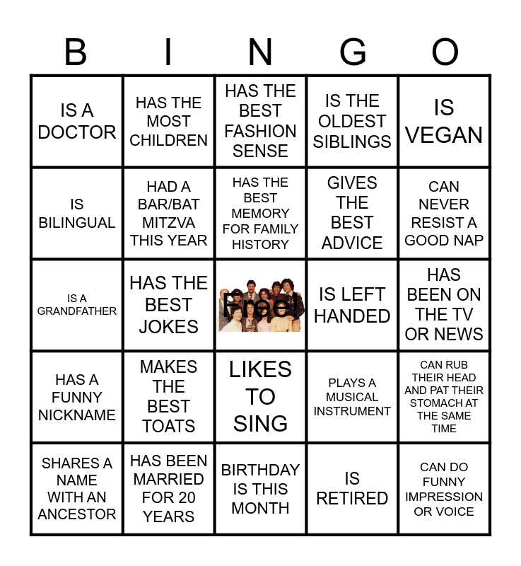 This bingo card has a free space and 29 words: SHARES A NAME WITH AN ANCESTOR, OWNED A COLLECTION AS A KID, HAS THE BEST JOKES, HAS A PET, IS A DOCTOR, HAS THE BEST FASHION SENSE, HAD A BAR/BAT MITZVA THIS YEAR, MAKES THE BEST TOATS, IS LEFT HANDED, HAS BEEN MARRIED FOR 20 YEARS, HAS BEEN ON THE TV OR NEWS, CAN DO FUNNY IMPRESSION OR VOICE, BIRTHDAY IS THIS MONTH, IS RETIRED, CAN NEVER RESIST A GOOD NAP, GOT MARRIED THIS YEAR, LIKES TO SING, HAS A FUNNY NICKNAME, IS VEGAN, IS A GRANDFATHER, PLAYS A MUSICAL INSTRUMENT, IS THE YOUNGEST HERE, GIVES THE BEST ADVICE, IS BILINGUAL, IS THE OLDEST SIBLINGS, HAS THE MOST CHILDREN, CAN RUB THEIR HEAD AND PAT THEIR STOMACH AT THE SAME TIME, HAS THE BEST MEMORY FOR FAMILY HISTORY and HAS A FOOD ALLERGY.