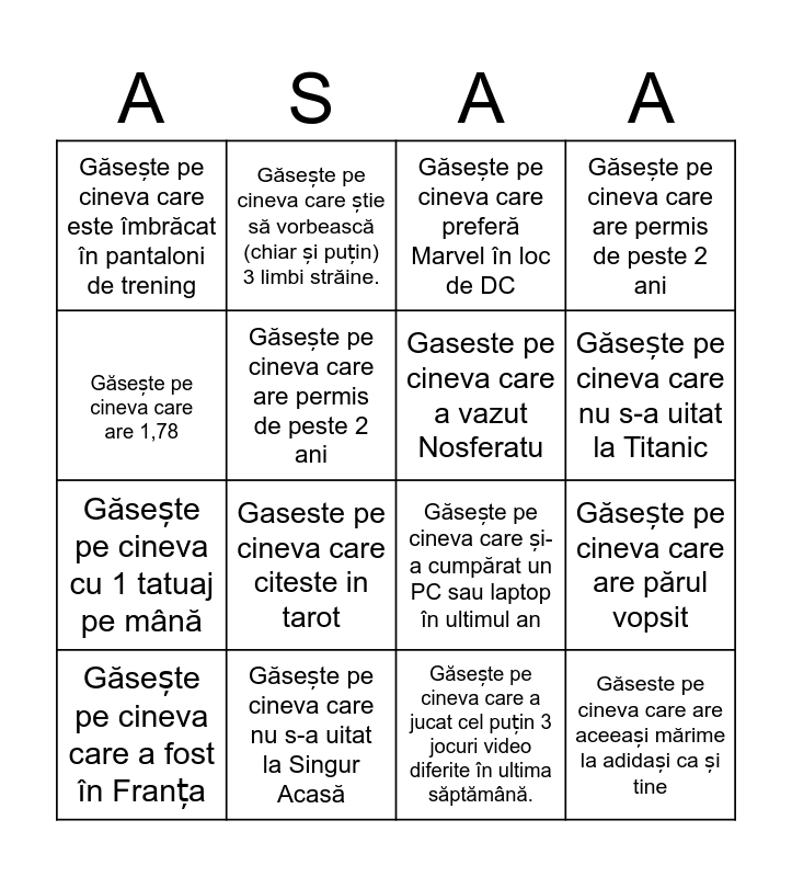 This bingo card has 60 words: Găsește pe cineva care are același film sau serial preferat ca tine., Găsește pe cineva care are același actor favorit ca și tine., Fă schimb de TOP 3 filme cu cineva și notează-le aici., Găseste pe cineva care are aceeași mărime la adidași ca și tine, Găsește pe cineva care a fost la cinema în ultima lună, Găsește pe cineva care știe 3 filme cu Leonardo DiCaprio, Gaseste pe cineva care a vazut Nosferatu, Găsește pe cineva cu aceeași culoare la șosete, Găsește pe cineva cu 1 tatuaj pe mână, Găsește pe cineva care a fost în cel puțin 2 țări străine în ultimul an, Găsește pe cineva care are permis de peste 2 ani, Găsește pe cineva care urăște o anumită legumă, Găsește pe cineva care are permis de peste 2 ani, Găsește pe cineva care nu bea alcool, Găsește pe cineva care are husa albastră la telefon, Găsește pe cineva care este îmbrăcat în pantaloni de trening, Găsește pe cineva care a fost în Franța, Găsește pe cineva care are 1,78, Găsește pe cineva care a vazut Barbie in cinema, Găsește pe cineva care nu s-a uitat la Titanic, Găsește pe cineva care nu s-a uitat la Singur Acasă, Găsește pe cineva care preferă Marvel în loc de DC, Găsește pe cineva care preferă filmele in locul serialelor, Gaseste pe cineva care prefera pizza in loc de paste, Gaseste pe cineva care a vazut singur acasa craciunul asta, Gasetse pe cineva care nu a vazut Harry Potter, Gasetse pe cineva care are alergie la un tip de mancare, Gaseste pe cineva care a platit pentru ChatGPT Plus, Gaseste pe cineva care citeste in tarot, Găsește pe cineva care are o colecție de peste 15 obiecte, Găsește pe cineva care are un animal de companie neobișnuit (nu pisică sau câine)., Găsește pe cineva care are un hobby creativ, Găsește pe cineva care a călătorit în mai mult de 5 țări., Găsește pe cineva care poate cânta la un instrument muzical., Găsește pe cineva care știe să vorbească (chiar și puțin) 3 limbi străine., Găsește pe cineva care preferă să muncească noaptea în loc de zi., Găsește pe cineva care are 3 aplicații de streaming instalate pe telefon, Găsește pe cineva care are părul vopsit, Găsește pe cineva care are a avut părul roz, Găsește pe cineva care și-a cumpărat un PC sau laptop în ultimul an, Găsește pe cineva care are mai mult de 2 frați., Găsește pe cineva care s-a uitat la un serial întreg (binge-watch) într-un singur weekend., Găsește pe cineva care a jucat cel puțin 3 jocuri video diferite în ultima săptămână., Găsește pe cineva care își știe chartul horoscopului., Găsește pe cineva care a adormit la cinema, Găsește pe cineva care a făcut un Karaoke în ultimele 6 luni., Găsește pe cineva care folosește același wallpaper pe telefon de mai bine de un an., Găsește pe cineva care a făcut live streaming pe orice platformă., Găsește pe cineva care a uitat să-și pună telefonul pe silențios într-un examen., Recrează o poză iconic din Avatar, Recrează o poză iconic din Harry Potter, Recrează o poză iconic din Avengers, Recrează o poză iconic din Lord of the Rings, Recrează o poză iconic din Twilight, Recrează o poză iconic din Star Wars, Recrează o poză iconic din Fast and Furious, Recrează o poză iconic din Piratii din Caraibe, Găsește pe cineva căruia îi place ramen Buldak, Găsește pe cineva care a fost la un festival în România în 2024 and Găsește pe cineva care are 15+ litere in nume+prenume.