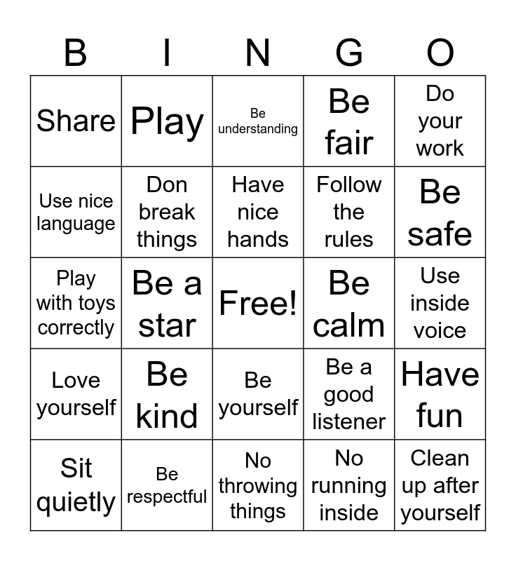 This bingo card has a free space and 24 words: Be kind, Be respectful, Have nice hands, Sit quietly, Do your work, Share, Use nice language, Play, Be calm, Be yourself, Follow the rules, Play with toys correctly, Be a good listener, Have fun, Don break things, No running inside, Use inside voice, Be understanding, Be safe, Be a star, Clean up after yourself, Love yourself, Be fair and No throwing things.