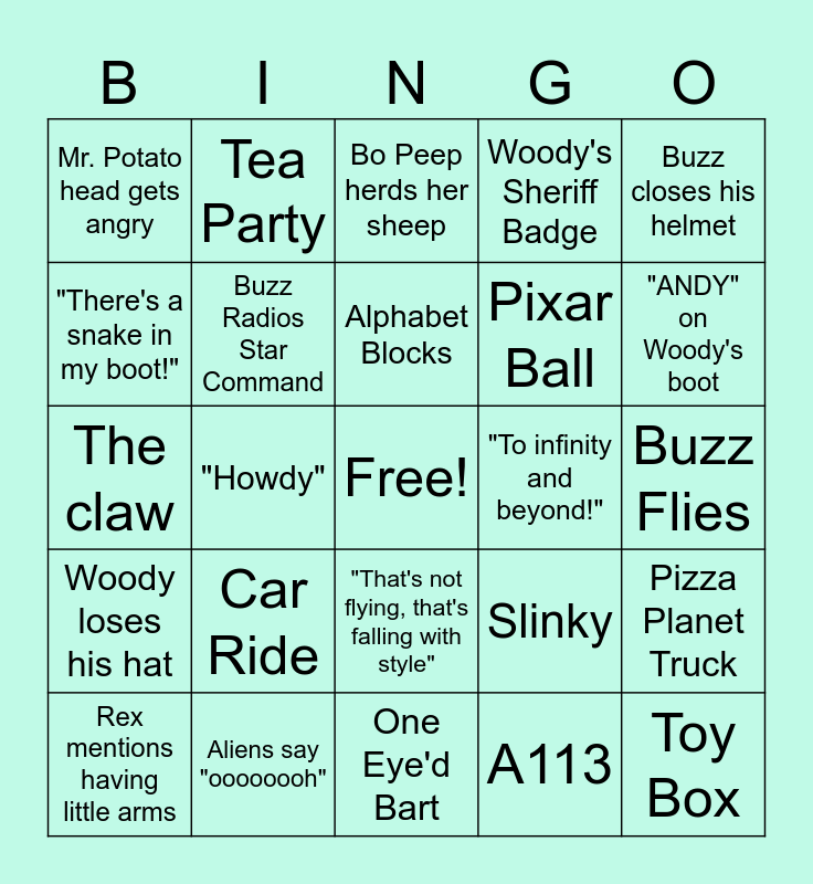 This bingo card has a free space and 38 words: Woody flails his arms, "Andy's Coming", Toys Freeze!, Buzz Radios Star Command, Pizza Planet Truck, Car Ride, Alphabet Blocks, Pixar Easter Egg, Buzz closes his helmet, Pixar Ball, "Howdy", Woody's Sheriff Badge, Toy Box, Buzz Flies, "There's a snake in my boot!", Woody loses his hat, Sid, Bo Peep herds her sheep, Battery Replacement, "To infinity and beyond!", Mr. Potato head gets angry, Aliens say "oooooooh", "ANDY" on Woody's boot, Rex mentions having little arms, Sid's pop tarts are ready, One Eye'd Bart, Baby Molly, "Ages 3 and up!", Toy Soldier is injured, Scud (Sid's dog), Emperor Zurg, "That's not flying, that's falling with style", A113, Tea Party, Hamm, Slinky, The claw and Sid's mutant toys.