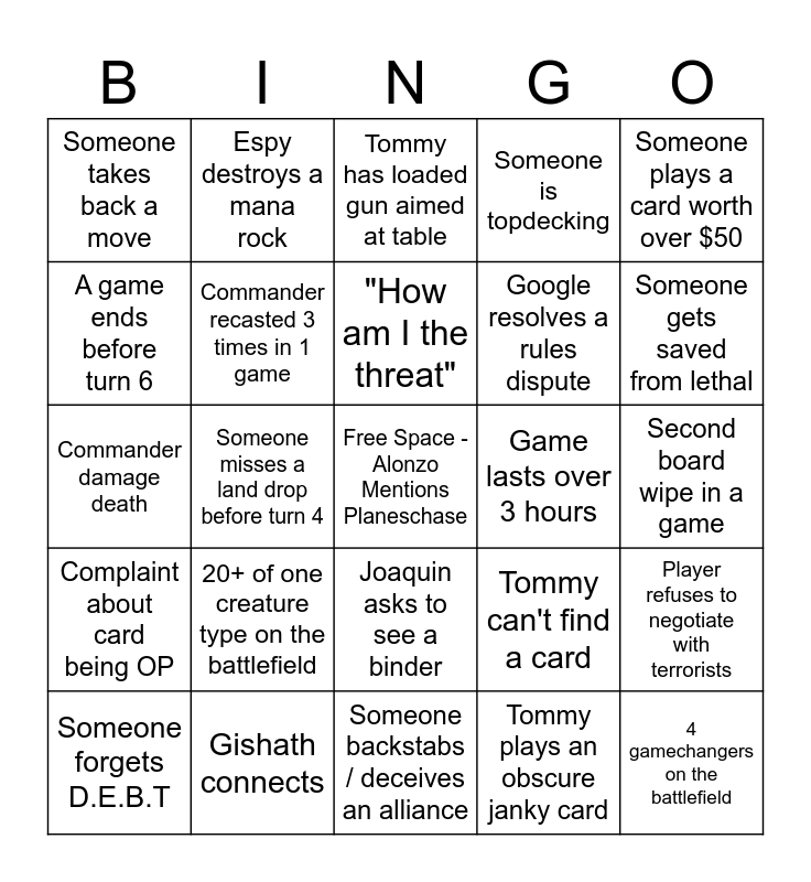 This bingo card has a free space and 26 words: Joaquin asks to see a binder, Tommy plays an obscure janky card, "How am I the threat", Gishath connects, Someone plays a card worth over $50, Someone takes back a move, A game ends before turn 6, Espy destroys a mana rock, Second board wipe in a game, Tommy can't find a card, Google resolves a rules dispute, Commander damage death, Player refuses to negotiate with terrorists, Someone forgets D.E.B.T, Someone misses a land drop before turn 4, Someone concedes early, Someone is topdecking, Complaint about card being OP, Tommy has loaded gun aimed at table, 4 gamechangers on the battlefield, Someone gets saved from lethal, Someone backstabs / deceives an alliance, Game lasts over 3 hours, 20+ of one creature type on the battlefield, Commander recasted 3 times in 1 game and Creature with 20+ power / toughness.
