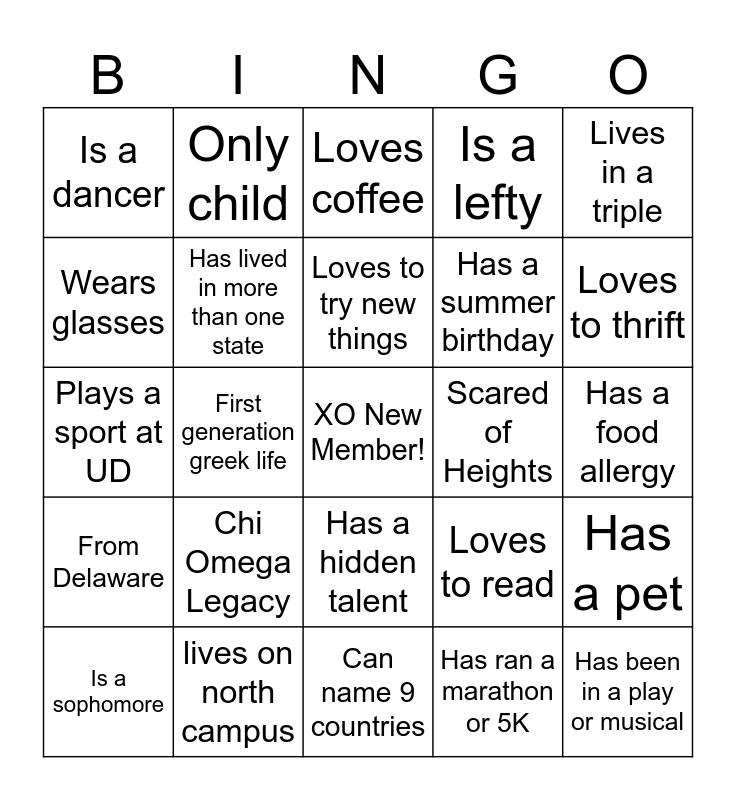 This bingo card has a free space and 24 words: Chi Omega Legacy, lives on north campus, Loves to try new things, Is a sophomore, Lives in a triple, Is a dancer, Wears glasses, Only child, Scared of Heights, Has a hidden talent, Has a summer birthday, Plays a sport at UD, Loves to read, Has a pet, Has lived in more than one state, Has ran a marathon or 5K, Has a food allergy, Loves coffee, Loves to thrift, First generation greek life, Has been in a play or musical, From Delaware, Is a lefty and Can name 9 countries.