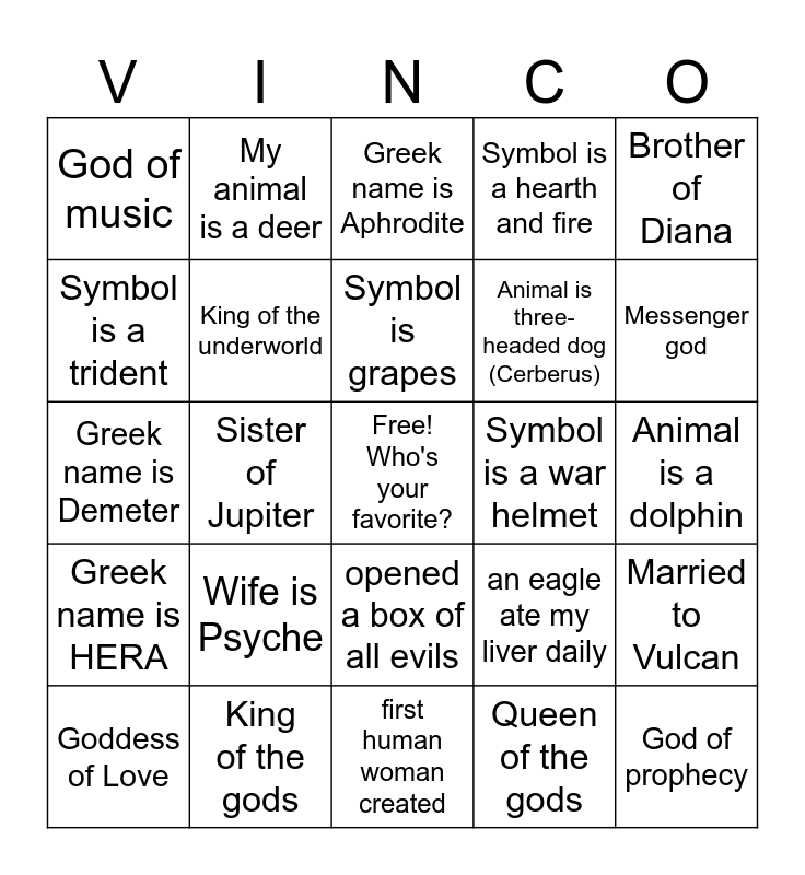 This bingo card has a free space and 60 words: Greek name is ZEUS, King of the gods, My symbol is a lightning bolt, Greek name is HERA, Queen of the gods, My animal is a peacock, King of the underworld, Parents are Cronus & Rhea, Animal is three-headed dog (Cerberus), Greek name is Hestia, Symbol is a hearth and fire, Roman name is Mars, Symbol is a trident, God of the sea, God of the sun, God of music, God of prophecy, Brother of Diana, God of war, Symbol is grapes, Symbol is a war helmet, Greek name is Aphrodite, Goddess of Love, Married to Vulcan, Born from the sea, Greek name is Dionysus, Greek name is Eros, Greek name is Hermes, Messenger god, Greek name is Athena, Goddess of war, Symbol is a hammer, Blacksmith god, Goddess of the moon, My animal is a deer, My symbol is a bow and arrow, Sister of Apollo, Sister of Jupiter, Goddess of grain and harvest, Greek name is Demeter, Son of Venus, Wife is Psyche, Animal is a dolphin, Stole fire from gods for Humans, an eagle ate my liver daily, Symbol is scissors and thread, We decide how long you live, father of Cronus and Rhea, god of the sky, opened a box of all evils, first human woman created, Greek name is Cronus, father of Jupiter, Neptune, June, and Vesta, symbol is the earth, I hold up the sky, my Greek name is Gaia, Goddess of the earth, Roman name means mother earth, symbols: lion and thorn and I am known for my kindness.