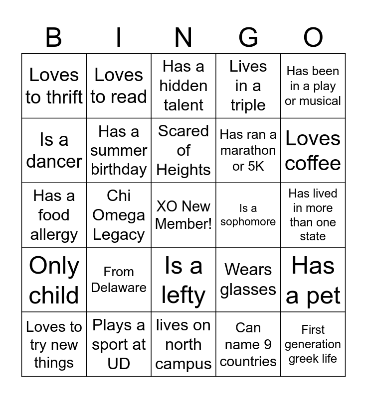 This bingo card has a free space and 24 words: From Delaware, Plays a sport at UD, Scared of Heights, Loves to try new things, Has been in a play or musical, Loves to thrift, Is a dancer, Loves to read, Is a sophomore, Is a lefty, Has ran a marathon or 5K, Has a food allergy, Wears glasses, Has a pet, Has a summer birthday, Can name 9 countries, Has lived in more than one state, Has a hidden talent, Loves coffee, Chi Omega Legacy, First generation greek life, Only child, Lives in a triple and lives on north campus.