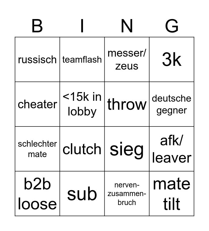 This bingo card has 16 words: sub, afk/ leaver, messer/ zeus, russisch, schlechter mate, teamflash, sieg, nerven- zusammen- bruch, cheater, <15k in lobby, b2b loose, 3k, clutch, deutsche gegner, throw and mate tilt.