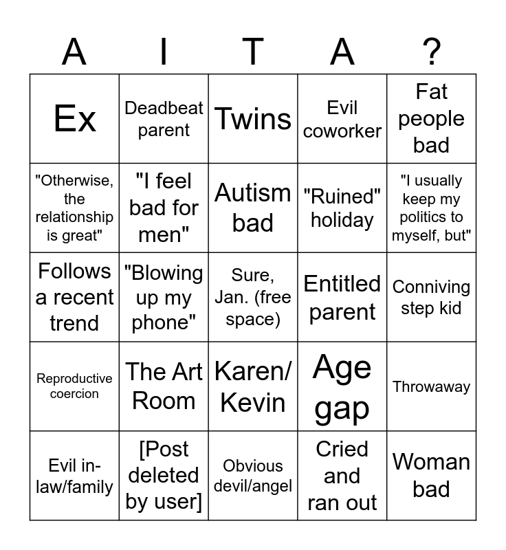This bingo card has a free space and 44 words: Trans bad, Woman bad, Vegans bad, Evil in-law/family, "Calmly explained", Cried and ran out, Twins, Cheating spouse, Fat people bad, [Post deleted by user], Evil coworker, Entitled parent, Karen/ Kevin, The Art Room, Weirdly close relative, Obvious devil/angel, Typed one handed, Follows a recent trend, Reddit takes the bait, "I usually keep my politics to myself, but", Deadbeat parent, Referred to r/LegalAdvice, DTMFA, Ex, Downvoted to oblivion, Conniving step kid, Pet tax, Slurs, Age gap, Reproductive coercion, Affair/ Divorce, Throwaway, absurdly long backstory, Edit: buries the lede, "Blowing up my phone", Unrealistic timetable, "Females", Bridezilla, Autism bad, "Otherwise, the relationship is great", "Ruined" holiday, Baby name drama, "I feel bad for men" and I'm being shunned.