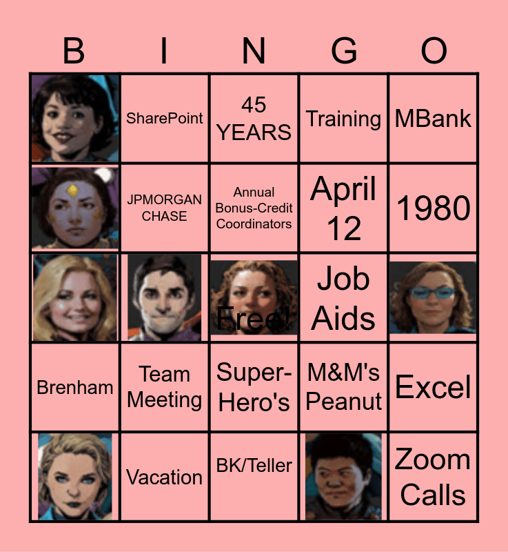 This bingo card has 7 images, a free space and 22 words: PPP, CSP, 45 YEARS, JPMORGAN CHASE, Team Meeting, Job Aids, Vacation, Zoom Calls, BK/Teller, 1980, Chase Answers, Super-Hero's, Brenham, MBank, M&M's Peanut, Coconut Pie, April 12, Training, SharePoint, Excel, Annual Bonus-Credit Coordinators and Office Parties.