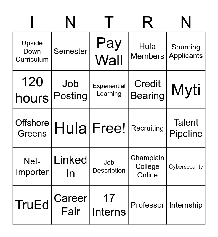 This bingo card has a free space and 29 words: TruEd, Vermont, Hula, Class Project, Upside Down Curriculum, Pay Wall, Job Posting, Linked In, Recruiting, Career Fair, Talent Pipeline, Internship, 17 Interns, Professor, Myti, Handshake, Job Description, Net-Importer, Sourcing Applicants, Offshore Greens, Champlain College Online, Leahy Center, Credit Bearing, 120 hours, Hula Members, Semester, Cybersecurity, Experiential Learning and 3-5 Internships.