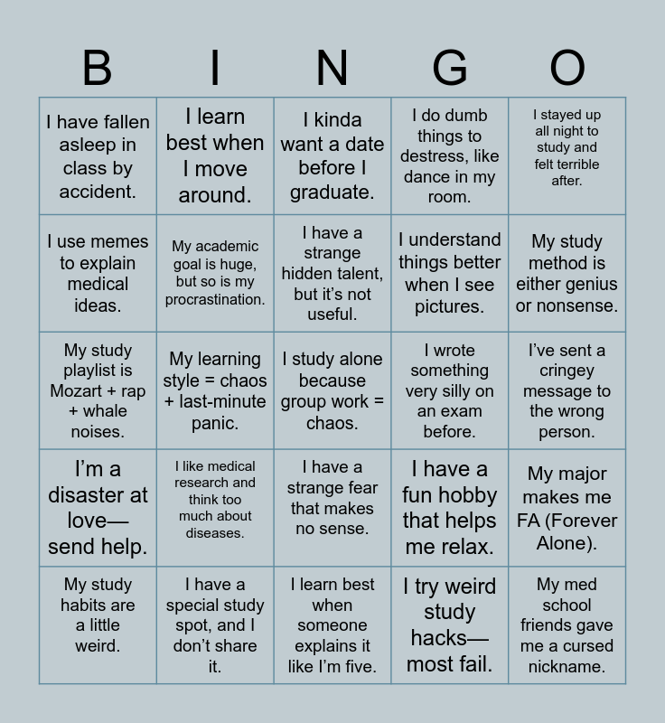 This bingo card has a free space and 24 words: I like medical research and think too much about diseases., I have a special study spot, and I don’t share it., I have a strange hidden talent, but it’s not useful., My study habits are a little weird., I stayed up all night to study and felt terrible after., I have fallen asleep in class by accident., I use memes to explain medical ideas., I learn best when I move around., I wrote something very silly on an exam before., I have a strange fear that makes no sense., I understand things better when I see pictures., My study playlist is Mozart + rap + whale noises., I have a fun hobby that helps me relax., My major makes me FA (Forever Alone)., My academic goal is huge, but so is my procrastination., I try weird study hacks—most fail., I’ve sent a cringey message to the wrong person., I kinda want a date before I graduate., My study method is either genius or nonsense., My learning style = chaos + last-minute panic., My med school friends gave me a cursed nickname., I’m a disaster at love—send help., I do dumb things to destress, like dance in my room. and I learn best when someone explains it like I’m five..