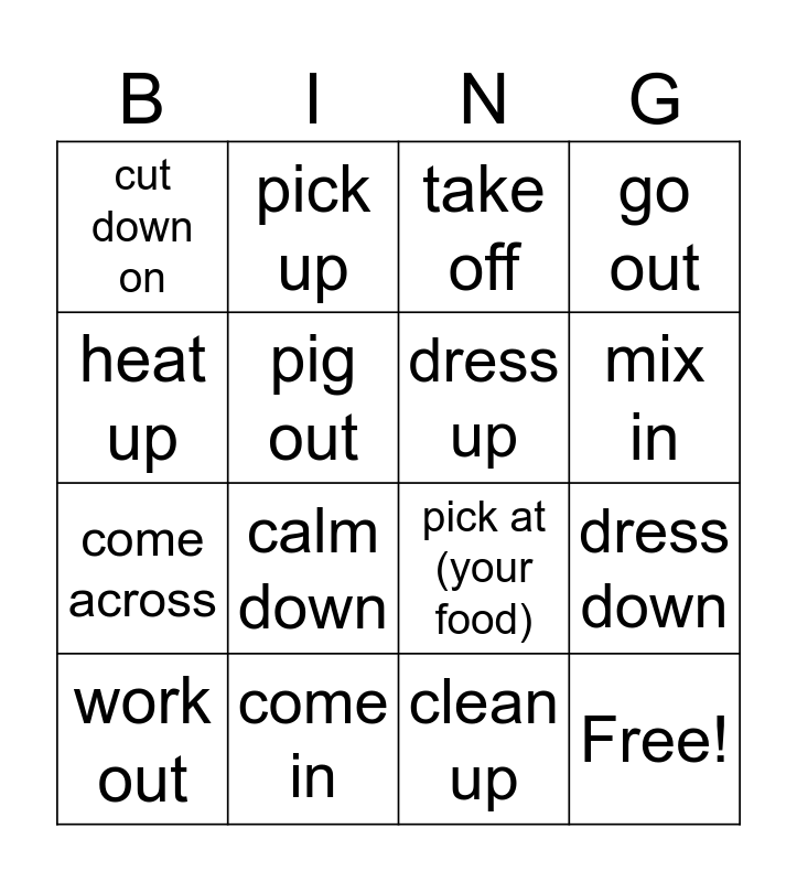This bingo card has 23 words: Free!, turn up, mix in, cut up, heat up, cut down on, pig out, pick up, work out, cheer (you) up, calm down, come across, get along with, get out, come in, put out, take off, pick at (your food), dress up, dress down, go out, clean up and wash up.