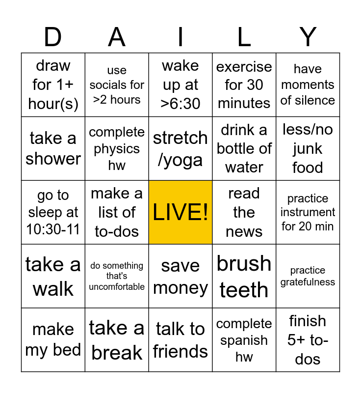 This bingo card has a free space and 27 words: brush teeth, read 1 chapter of a book, drink a bottle of water, talk to friends, take a shower, wake up at >6:30, use socials for >2 hours, take a walk, read the news, practice gratefulness, go to sleep at 10:30-11, exercise for 30 minutes, make my bed, take a break, less/no junk food, upkeep room, complete physics hw, stretch /yoga, do something that's uncomfortable, draw for 1+ hour(s), practice instrument for 20 min, complete spanish hw, make a list of to-dos, finish 5+ to-dos, save money, have moments of silence and work on personal projects 1+ hrs.