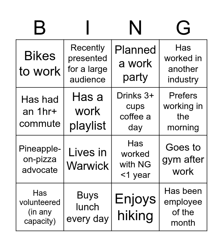 This bingo card has 35 words: Prefers remote work, Prefers working in office, Has a snack stash, Drinks 3+ cups coffee a day, Has worked with NG 3+ years, Has worked in another industry, Has a work playlist, Has 0 unread emails, Prefers working in the morning, Prefers working at night, Has worked with NG <1 year, Has had an 1hr+ commute, Manager, This is their first job, Bikes to work, Buys lunch every day, Played prank on a colleague, Goes to gym after work, Has been employee of the month, Has volunteered (in any capacity), Been on holiday recently, Was promoted this year, Switched teams recently, Led a project, Planned a work party, Lives in Warwick, Has a pet, Has been skydiving, Pineapple-on-pizza advocate, Enjoys hiking, Is a dedicated fan of a sports team, Can sing, Has been late for something in the past week, Recently presented for a large audience and Loves Marmite.