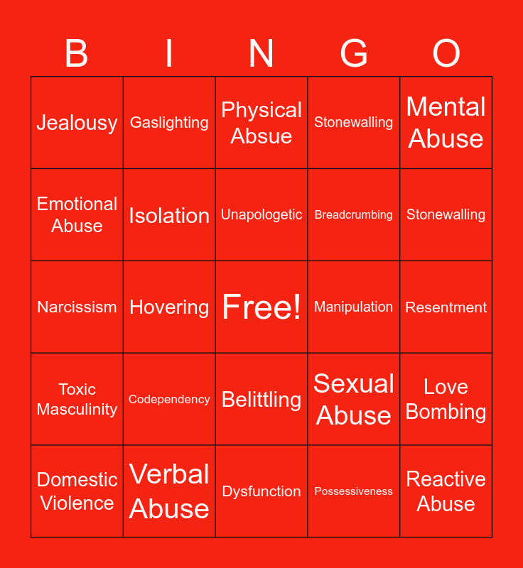 This bingo card has a free space and 24 words: Domestic Violence, Codependency, Unapologetic, Possessiveness, Mental Abuse, Jealousy, Gaslighting, Physical Absue, Manipulation, Resentment, Narcissism, Isolation, Sexual Abuse, Love Bombing, Emotional Abuse, Verbal Abuse, Dysfunction, Stonewalling, Stonewalling, Toxic Masculinity, Hovering, Belittling, Breadcrumbing and Reactive Abuse.