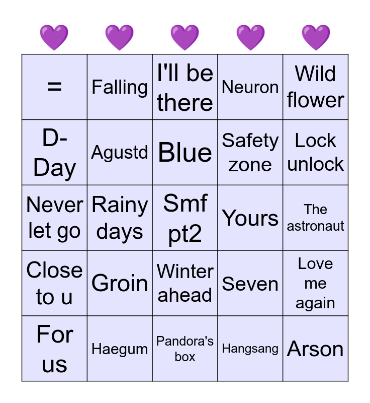 This bingo card has a free space and 24 words: Groin, Haegum, Blue, For us, Wild flower, =, D-Day, Falling, Yours, Winter ahead, Safety zone, Never let go, Seven, Love me again, Agustd, Hangsang, The astronaut, I'll be there, Lock unlock, Rainy days, Arson, Close to u, Neuron and Pandora's box.