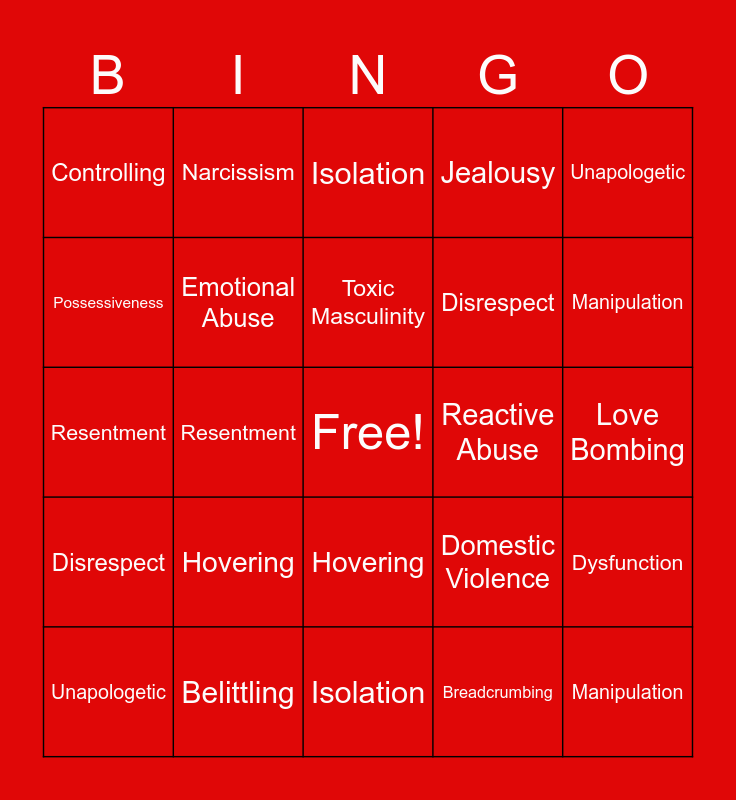 ⚠ This card has duplicate items: Gas Lighting (2), Manipulation (2), Codependency (2), Isolation (2), Hovering (2), Verbal Abuse (2), Narcissism (2), Physical Abuse (2), Possessiveness (2), Belittling (2), Emotional Abuse (2), Jealousy (2), Dysfunction (2), Domestic Violence (2), Love Bombing (2), Stonewalling (2), Toxic Masculinity (2), Reactive Abuse (2), Sexual Abuse (2), Unapologetic (2), Resentment (2), Breadcrumbing (2), Controlling (2), Disrespect (2), Lying (2)