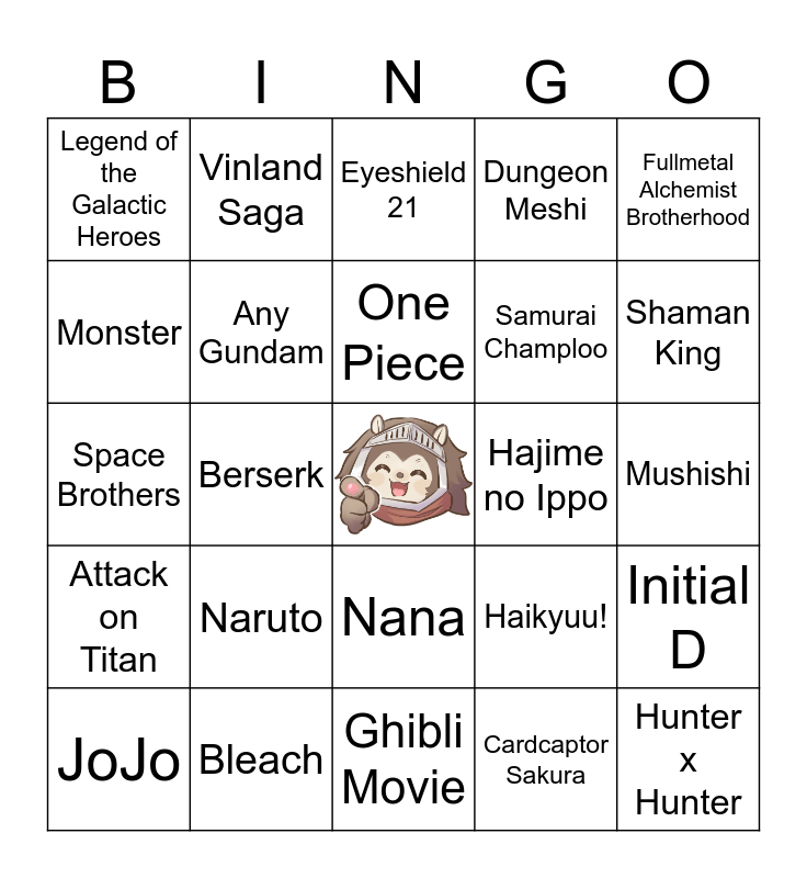 This bingo card has a free space and 24 words: Naruto, Bleach, One Piece, JoJo, Fullmetal Alchemist Brotherhood, Legend of the Galactic Heroes, Monster, Vinland Saga, Hajime no Ippo, Nana, Samurai Champloo, Space Brothers, Haikyuu!, Initial D, Any Gundam, Cardcaptor Sakura, Mushishi, Eyeshield 21, Shaman King, Berserk, Hunter x Hunter, Attack on Titan, Dungeon Meshi and Ghibli Movie.