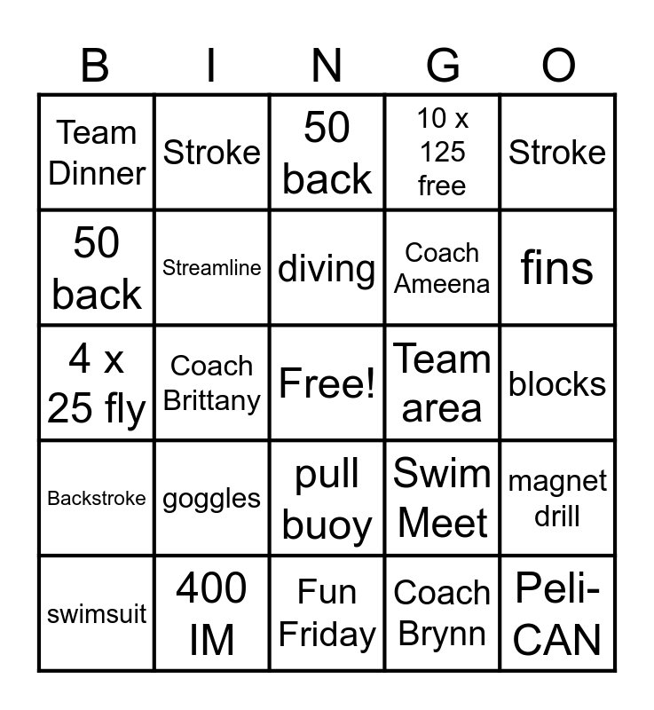 This bingo card has 1 images, a free space and 200 words: Butterfly, Backstroke, Freestyle, Breaststroke, IM, Relay, Coach Brittany, Coach Brynn, Coach Ameena, Coach Delina, Coach Naela, Peli-CAN, Streamline, kick board, pull buoy, water polo, magnet drill, 6 kick switch drill, spring, 500 free, 50 back, 25 breast, 4 x 25 fly, 400 IM, 10 x 125 free, 10 x 75 free, snorkel, Swim Meet, Team Dinner, goggles, swimsuit, zipper drill, 3 second glide drill, modified dolphin dives, blocks, diving, Take your mark!, 2 hand touch, Finish on you back, ribbons, Pelican Harbor, Bolingbrook, fins, Fun Friday, Funday Monday, cap, Bullpen, Team area, Breath every 3, Stroke, 10 x 125 free, 4 x 25 fly, Backstroke, Bullpen, Coach Brynn, fins, IM, Pelican Harbor, spring, Take your mark!, 10 x 75 free, 400 IM, blocks, Butterfly, Coach Delina, Freestyle, kick board, pull buoy, Streamline, Team area, 2 hand touch, 50 back, Bolingbrook, cap, Coach Naela, Fun Friday, magnet drill, Relay, Stroke, Team Dinner, 25 breast, 500 free, Breaststroke, Coach Ameena, diving, Funday Monday, modified dolphin dives, ribbons, Swim Meet, waterpolo, 3 second glide drill, 6 kick switch dril, Breath every 3, Coach Brittany, Finish on you back, goggles, Peli-CAN, snorkel, swimsuit, zipper drill, 10 x 125 free, Bullpen, IM, Take your mark!, blocks, Freestyle, Streamline, 50 back, Coach Naela, Relay, 25 breast, Coach Ameena, modified dolphin dives, waterpolo, Breath every 3, goggles, swimsuit, 4 x 25 fly, Coach Brynn, Pelican Harbor, 10 x 75 free, Butterfly, kick board, Team area, Bolingbrook, Fun Friday, Stroke, 500 free, diving, ribbons, 3 second glide drill, Coach Brittany, Peli-CAN, zipper drill, Backstroke, fins, spring, 400 IM, Coach Delina, pull buoy, 2 hand touch, cap, magnet drill, Team Dinner, Breaststroke, Funday Monday, Swim Meet, 6 kick switch dril, Finish on your back, snorkel, 10 x 125 free, 10 x 75 free, 2 hand touch, 25 breast, 3 second glide drill, 4 x 25 fly, 400 IM, 50 back, 500 free, 6 kick switch dril, Backstroke, blocks, Bolingbrook, Breaststroke, Breath every 3, Bullpen, Butterfly, cap, Coach Ameena, Coach Brittany, Coach Brynn, Coach Delina, Coach Naela, diving, Finish on your back, fins, Freestyle, Fun Friday, Funday Monday, goggles, IM, kick board, magnet drill, modified dolphin dives, Peli-CAN, Pelican Harbor, pull buoy, Relay, ribbons, snorkel, spring, Streamline, Stroke, Swim Meet, swimsuit, Take your mark!, Team area, Team Dinner, water polo and zipper drill.
