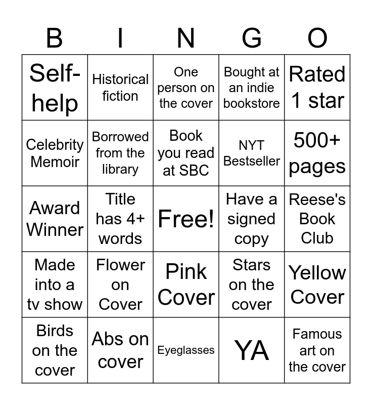 This bingo card has a free space and 86 words: Red Cover, Blue Cover, Pink Cover, Sarah J. Maas, Cartoons on cover, Horror, Mystery, Romance, Orange Cover, Stephen King, Read with Jenna, Oprah's Book Club, Yellow Cover, Reese's Book Club, Book you read this year, Book you read at SBC, Jodi Picoult book, Black book, BIPOC author, NJ Author, Fantasy, Sci Fi, Award Winner, Dystopian, YA, Starts with "the", Part of a series, Published this year, Own but haven't read, Sports Romance, Abs on cover, Water on Cover, Real person on Cover, Flower on Cover, Celebrity Memoir, Listened to audiobook, 500+ pages, Strong FMC, Starts with "A", Title has 4+ words, White Cover, Published 10+ years ago, Cosplayed a character, Have a signed copy, Rated 5 stars, Rated 1 star, Favorite Book, Historical fiction, Nonfiction, Spicy, Foreign author, Made into a movie, Made into a tv show, Recommended by a friend, Girl facing away, Author bigger than title, Trees on cover, NYT Bestseller, Bought at an indie bookstore, Borrowed from the library, Self-help, Favorite author, Met the author, People kissing, More than 2 people on the cover, One person on the cover, Sword on the cover, Famous art on the cover, Skull on the cover, Snake on the cover, Hand or hands on the cover, Fruit on the cover, Birds on the cover, Black & white photo, Greek myth retelling, Crown on the cover, Eyeglasses, Food in the title, Animal on the cover, DNF’d, Dragon on the cover, Snow on the cover, Building or house on the cover, Only text, no picture, Stars on the cover and Never heard of.