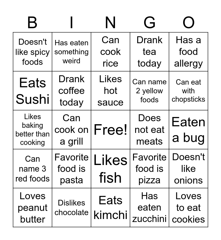 This bingo card has a free space and 24 words: Favorite food is pasta, Dislikes chocolate, Likes hot sauce, Loves peanut butter, Has a food allergy, Doesn't like spicy foods, Eats Sushi, Has eaten something weird, Does not eat meats, Likes fish, Can name 2 yellow foods, Likes baking better than cooking, Favorite food is pizza, Doesn't like onions, Drank coffee today, Has eaten zucchini, Eaten a bug, Can cook rice, Can eat with chopsticks, Can cook on a grill, Loves to eat cookies, Can name 3 red foods, Drank tea today and Eats kimchi.