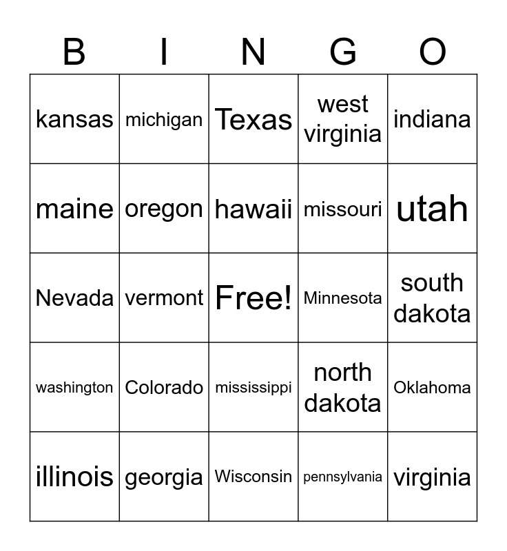 This bingo card has a free space and 24 words: Colorado, georgia, hawaii, illinois, indiana, kansas, maine, michigan, Minnesota, mississippi, missouri, Nevada, north dakota, Oklahoma, oregon, pennsylvania, south dakota, Texas, utah, vermont, virginia, washington, west virginia and Wisconsin.