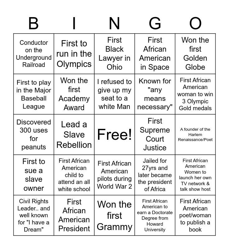 This bingo card has a free space and 24 words: First African American child to attend an all white school, First African American President, I refused to give up my seat to a white Man, Civil Rights Leader.. and well known for "I have a Dream", Won the first Golden Globe, Conductor on the Underground Railroad, First to play in the Major Baseball League, First to run in the Olympics, First Supreme Court Justice, First African American pilots during World War 2, Known for "any means necessary", Discovered 300 uses for peanuts, Jailed for 27yrs and later became the president of Africa, First African American Women to launch her own TV network & talk show host, Won the first Academy Award, First African American to earn a Doctorate Degree from Howard University, A founder of the Harlem Renaissance/Poet, First Black Lawyer in Ohio, First African American woman to win 3 Olympic Gold medals, Lead a Slave Rebellion, First African American poet/woman to publish a book, First to sue a slave owner, First African American in Space and Won the first Grammy.