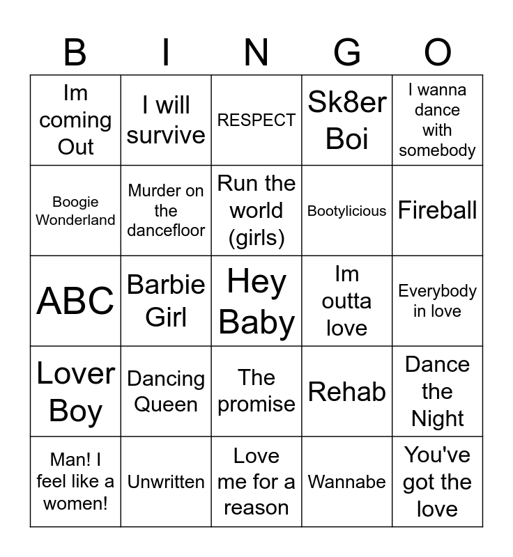 This bingo card has a free space and 24 words: Dancing Queen, Unwritten, Run the world (girls), Man! I feel like a women!, I wanna dance with somebody, Im coming Out, Boogie Wonderland, I will survive, Im outta love, The promise, Bootylicious, ABC, Rehab, Dance the Night, Murder on the dancefloor, Wannabe, Everybody in love, RESPECT, Fireball, Barbie Girl, You've got the love, Lover Boy, Sk8er Boi and Love me for a reason.