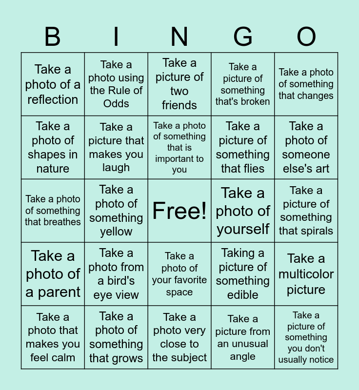This bingo card has a free space and 24 words: Take a photo from a bird's eye view, Take a photo of something that grows, Take a photo of something that is important to you, Take a photo that makes you feel calm, Take a photo of something that changes, Take a photo of a reflection, Take a photo of shapes in nature, Take a photo using the Rule of Odds, Take a photo of yourself, Take a photo of your favorite space, Take a picture of something that flies, Take a photo of something that breathes, Taking a picture of something edible, Take a multicolor picture, Take a picture that makes you laugh, Take a picture from an unusual angle, Take a picture of something that spirals, Take a picture of two friends, Take a photo of someone else's art, Take a photo of something yellow, Take a picture of something you don't usually notice, Take a photo of a parent, Take a picture of something that's broken and Take a photo very close to the subject.