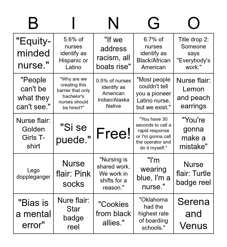 This bingo card has a free space and 29 words: "Bias is a mental error", Title Drop 1: Someone says "Everybody's work.", "Si se puede.", No more stolen sisters, "Equity-minded nurse.", "If we address racism, all boats rise", "Why are we creating this barrier that only bachelor's nurses should be hired?", Nurse flair: Pink socks, "You have 30 seconds to call a rapid response or I'm gonna call the operator and do it myself.", Nure flair: Star badge reel, "You're gonna make a mistake", Serena and Venus, "Cookies from black allies.", "Oklahoma had the highest rate of boarding schools.", Nurse flair: Lemon and peach earrings, "Who takes care of your loved ones matters.", "Nursing is shared work. We work in shifts for a reason.", Lego doppleganger, Title drop 2: Someone says "Everybody's work.", Nurse flair: Golden Girls T-shirt, "I'm wearing blue, I'm a nurse.", Nurse flair: Beaded stethoscope, "Most people couldn't tell you a pioneer Latino nurse, but we exist.", "People can't be what they can't see.", 6.7% of nurses identify as Black/African American, 5.6% of nurses identify as Hispanic or Latino, Nurse flair: Turtle badge reel, 0.5% of nurses identify as American Indian/Alaska Native and Seattle, Washington.