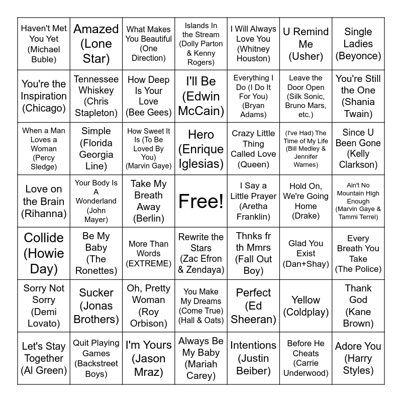 This bingo card has a free space and 100 words: Can't Help Falling In Love (Hailey Reinhart), Perfect (Ed Sheeran), When a Man Loves a Woman (Percy Sledge), The Power of Love (Huey Lewis & The News), All of Me (John Legend), Love You Like A Love Song (Selena Gomez), No One (Alicia Keys), I Love You Always Forever (Donna Lewis), One Call Away (Charlie Puth), I'll Make Love to You (Boyz II Men), Love Me Like You Do (Ellie Goulding), Higher & Higher (Jackie Wilson), I'm Yours (Jason Mraz), Love on the Brain (Rihanna), Just the Way You Are (Bruno Mars), Glad You Exist (Dan+Shay), Tennessee Whiskey (Chris Stapleton), Slow Hands (Niall Horan), My Girl (The Temptations), Kiss Me (Sixpence None the Richer), Dilemma (Nelly), Love Story (Taylor Swift), Yellow (Coldplay), Your Song (Elton John), Sucker (Jonas Brothers), You're Still the One (Shania Twain), I Will Always Love You (Whitney Houston), Crazy Little Thing Called Love (Queen), Everywhere (Fleetwood Mac), We Belong Together (Mariah Carey), Everything I Do (I Do It For You) (Bryan Adams), Haven't Met You Yet (Michael Buble), Talk (Khalid), Let's Stay Together (Al Green), Take My Breath Away (Berlin), You're the Inspiration (Chicago), (I've Had) The Time of My Life (Bill Medley & Jennifer Warnes), Time After Time (Cyndi Lauper), More Than Words (EXTREME), Adore You (Harry Styles), Intentions (Justin Beiber), Oh, Pretty Woman (Roy Orbison), I'll Be (Edwin McCain), Hold On, We're Going Home (Drake), How Deep Is Your Love (Bee Gees), What Makes You Beautiful (One Direction), Brown Eyed Girl (Van Morrison), You Make My Dreams (Come True) (Hall & Oats), Best of My Love (The Emotions), Your Body Is A Wonderland (John Mayer), How Do I Live (LeAnn Rimes), Collide (Howie Day), Be My Baby (The Ronettes), At Last (Etta James), Nothing Compares 2 U (Sinead O'Connor), Lovefool (The Cardigans), Baby Love (The Supremes), Wonderwall (Oasis), The Way (Ariana Grande), Islands In the Stream (Dolly Parton & Kenny Rogers), Love On Top (Beyonce), You Were Meant For Me (Jewel), A Moment Like This (Kelly Clarkson), I Got You Babe (Sonny & Cher), Eternal Flame (The Bangles), Sweet Child O' Mine (Guns N' Roses), I Melt with You (Modern English), Ain't No Mountain High Enough (Marvin Gaye & Tammi Terrel), Fade into You (Mazzy Star), I Swear (All-4-One), I Say a Little Prayer (Aretha Franklin), How Sweet It Is (To Be Loved By You) (Marvin Gaye), Wonderful Tonight (Eric Clapton), Sugar (Maroon 5), Always Be My Baby (Mariah Carey), Quit Playing Games (Backstreet Boys), Like I'm Gonna Lose You (Megan Trainor), U Remind Me (Usher), Thank God (Kane Brown), Rewrite the Stars (Zac Efron & Zendaya), Forever After All Luke Combs), Leave the Door Open (Silk Sonic, Bruno Mars, etc.), A Thousand Miles (Vanessa Carlton), Hero (Enrique Iglesias), Every Breath You Take (The Police), Amazed (Lone Star), Let Me Love You (Mario), Marry You (Bruno Mars), Your Love (The Outfield), Simple (Florida Georgia Line), Thnks fr th Mmrs (Fall Out Boy), Cry Me a River (Justin Timerlake), Is She Really Going Out With Him? (Joe Jackson), Since U Been Gone (Kelly Clarkson), Single Ladies (Beyonce), We Are Never Ever Getting Back Together (Taylor Swift), Before He Cheats (Carrie Underwood), Sorry Not Sorry (Demi Lovato), Potential Break Up Song (Aly & AJ) and Leave (Get Out) (Jo Jo).