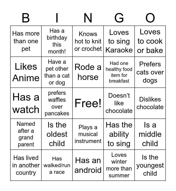 This bingo card has a free space and 71 words: Can play an instrument, Has a birthday this month!, Wears glasses, Has an iphone, Has an android, Has traveled outside the country, Loves to sing Karaoke, Loves to draw or paint, Had one healthy food item for breakfast, Plays video games, Has lived in another country, Is Left-handed, Prefers cats over dogs, Has more than one pet, Has broken a bone, Has a watch, Has the ability to sing, Loves to cook or bake, Has never seen a Harry Potter movie, Dislikes chocolate, Is the oldest child, Is the youngest child, Is a middle child, Favorite color is blue, Loves to read, Loves to dance, Was born in another country, Can speak more than one language, Has more than two pets, Prefers tea over coffee, Has walked/run a race, Has no Facebook account, Regularly Volunteers, Enjoys riding roller coasters, Loves winter more than summer, Never uses the snooze button, Has a garden, Watches reality TV, Likes Anime, Has taken a selfie with a celebrity, Plays a musical instrument, Has an aquarium, Named after a grand parent, Loves theme parks, Knows a magic trick, Loves summer more than winter, Met someone famous, Have a pet other than a cat or dog, Likes spicy food, Loves camping, Loves rainy days, Shares a name with an ancestor, Doesn’t like chocolate, Has a celebrity autograph, Loves trying new foods, Likes to get up early, Rode a horse, Lived overseas, Has been to a tropical island, Has siblings, Likes chocolate, Is an only child, prefers waffles over pancakes, Shares the same favorite color as you, Can whistle, Likes to sleep in, Knows hot to knit or crochet, Favorite sport is basketball, Favorite sport is tennis, Favorite sport is badminton and Favorite sport is Volleyball.