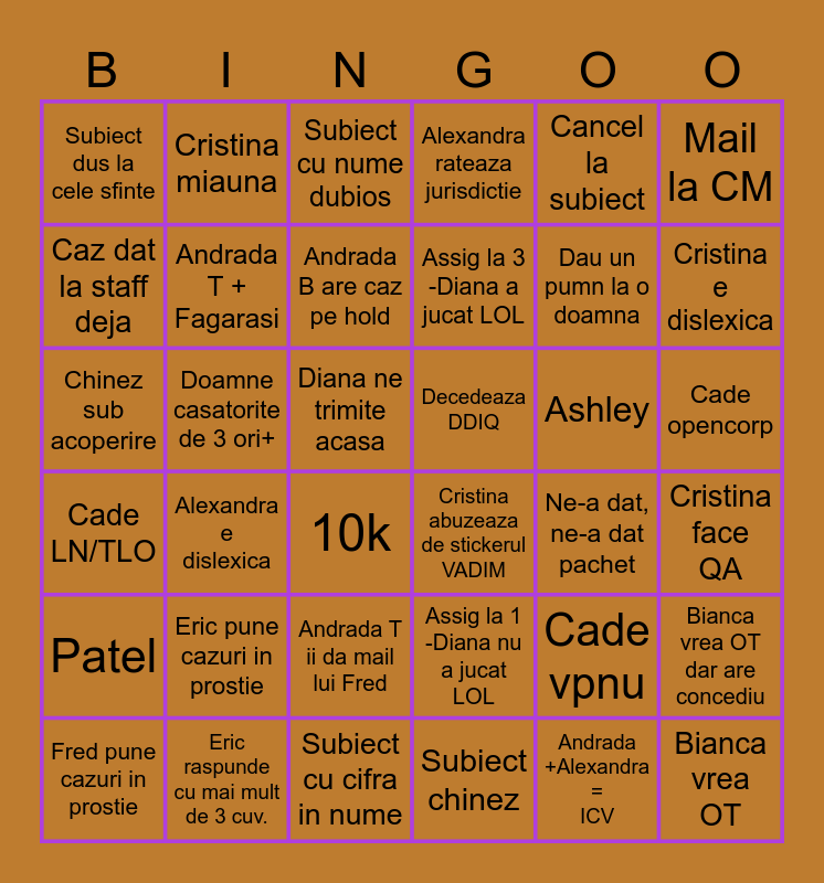 This bingo card has 36 words: Assig la 1 -Diana nu a jucat LOL, Andrada T ii da mail lui Fred, Subiect chinez, Caz dat la staff deja, Cade LN/TLO, Decedeaza DDIQ, Andrada T + Fagarasi, Subiect cu cifra in nume, Cancel la subiect, Cade vpnu, Cristina e dislexica, Alexandra rateaza jurisdictie, Bianca vrea OT dar are concediu, Doamne casatorite de 3 ori+, Assig la 3 -Diana a jucat LOL, Subiect dus la cele sfinte, Patel, Ashley, Chinez sub acoperire, Subiect cu nume dubios, Diana ne trimite acasa, Alexandra e dislexica, Cristina abuzeaza de stickerul VADIM, 10k, Ne-a dat, ne-a dat pachet, Cristina miauna, Dau un pumn la o doamna, Eric raspunde cu mai mult de 3 cuv., Andrada B are caz pe hold, Mail la CM, Bianca vrea OT, Fred pune cazuri in prostie, Cristina face QA, Cade opencorp, Eric pune cazuri in prostie and Andrada +Alexandra = ICV.