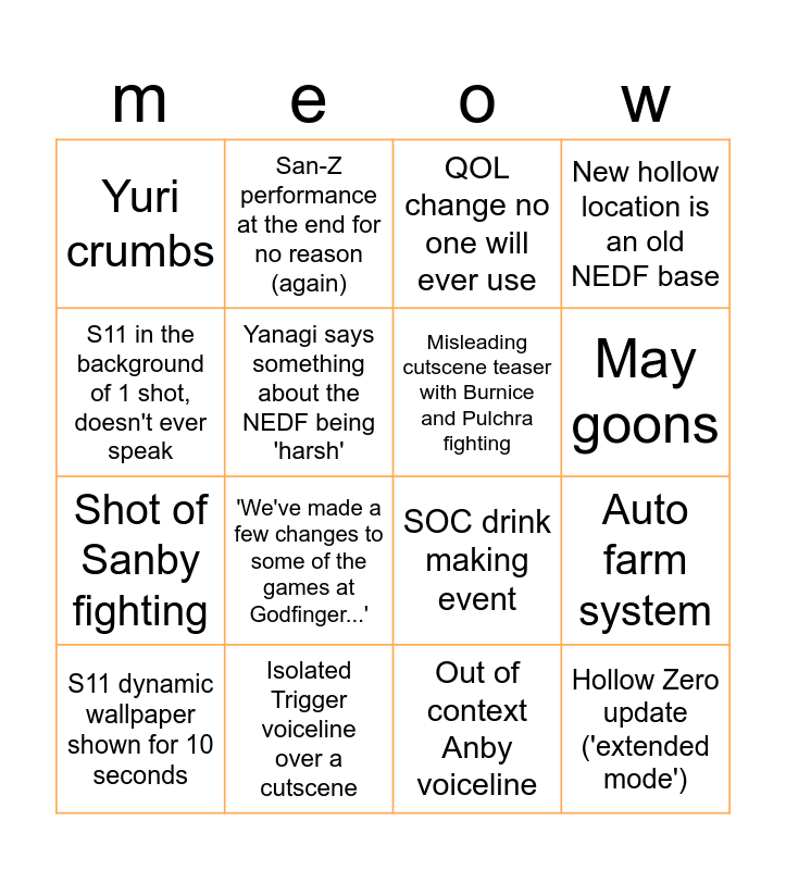 This bingo card has 16 words: Isolated Trigger voiceline over a cutscene, Auto farm system, QOL change no one will ever use, Yuri crumbs, Shot of Sanby fighting, San-Z performance at the end for no reason (again), SOC drink making event, Out of context Anby voiceline, S11 in the background of 1 shot, doesn't ever speak, Yanagi says something about the NEDF being 'harsh', S11 dynamic wallpaper shown for 10 seconds, New hollow location is an old NEDF base, 'We've made a few changes to some of the games at Godfinger...', May goons, Misleading cutscene teaser with Burnice and Pulchra fighting and Hollow Zero update ('extended mode').