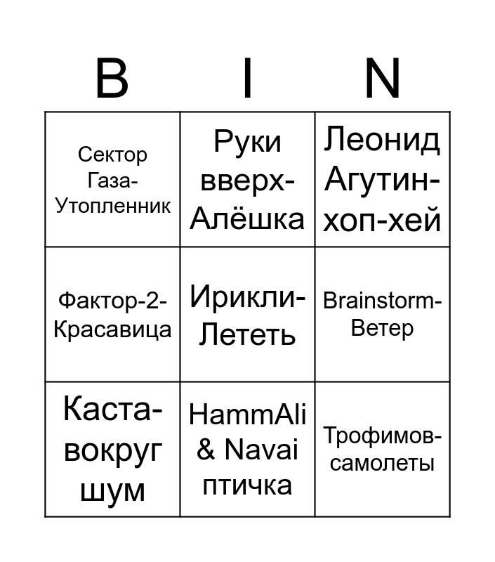 This bingo card has 30 words: Сидим с бобром за столом, Элджей, Feduk-розовое вино, Отпетые мошенники-люби меня люби, Полина Гагарина-спектакль окончен, Сектор Газа-Утопленник, Леонид Агутин-хоп-хей, Каста-вокруг шум, Надежда Кадышева-веночек, Женя Трофимов-поезда, Любэ-конь, Баста-моя игра, Порнофильмы-Я так соскучился, Алексей Чумаков-Счастье, JONY-Комета, Антон Токарев-Седьмой лепесток, Xolidayboy-пожары, Jakone, Kiliana - Асфальт, Akmal’-Раневская, 1Ирина Кайратовна-Айдахар, Ирикли-Лететь, Моя Мишель-Посмотри в глаза, Мираж-Новый герой, Руки вверх-Алёшка, Трофимов-самолеты, Brainstorm-Ветер, Фактор-2-Красавица, Макс Корж жить в кайф, Macan-asphalt 8, HammAli & Navai птичка and Сектор Газа-колхозный панк.