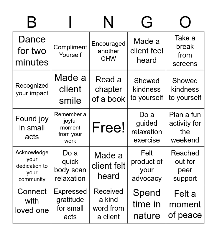 This bingo card has a free space and 24 words: Connect with loved one, Do a quick body scan relaxation, Read a chapter of a book, Spend time in nature, Take a break from screens, Dance for two minutes, Compliment Yourself, Encouraged another CHW, Do a guided relaxation exercise, Plan a fun activity for the weekend, Found joy in small acts, Made a client smile, Felt product of your advocacy, Reached out for peer support, Recognized your impact, Expressed gratitude for small acts, Received a kind word from a client, Made a client feel heard, Showed kindness to yourself, Acknowledge your dedication to your community, Remember a joyful moment from your work, Made a client felt heard, Showed kindness to yourself and Felt a moment of peace.