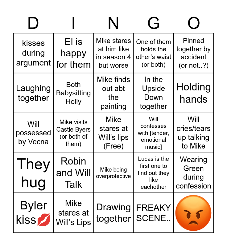 This bingo card has 1 images, a free space and 23 words: Robin and Will Talk, Mike stares at Will’s Lips, Mike finds out abt the painting, Byler kiss💋, Pinned together by accident (or not..?), kisses during argument, Laughing together, El is happy for them, Will confesses with [tender, emotional music], Mike being overprotective, In the Upside Down together, Will possessed by Vecna, Lucas is the first one to find out they like eachother, Wearing Green during confession, Both Babysitting Holly, FREAKY SCENE.., Will cries/tears up talking to Mike, Mike stares at him like in season 4 but worse, Holding hands, Mike visits Castle Byers (or both of them), They hug, One of them holds the other’s waist (or both) and Drawing together.
