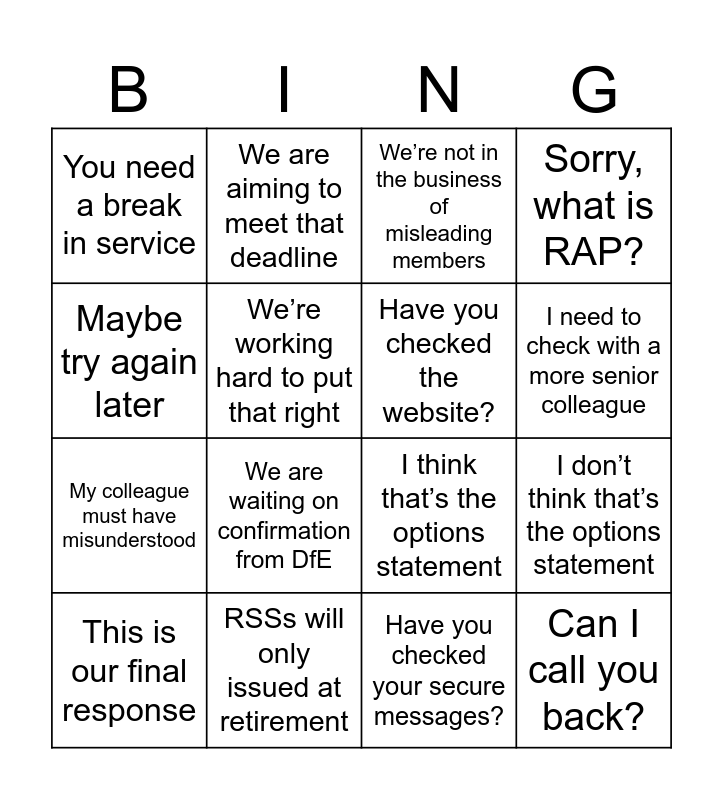 This bingo card has 16 words: RSSs will only issued at retirement, I don’t think that’s the options statement, We’re not in the business of misleading members, You need a break in service, My colleague must have misunderstood, We are aiming to meet that deadline, I think that’s the options statement, Have you checked your secure messages?, Maybe try again later, We’re working hard to put that right, This is our final response, Sorry, what is RAP?, We are waiting on confirmation from DfE, I need to check with a more senior colleague, Have you checked the website? and Can I call you back?.