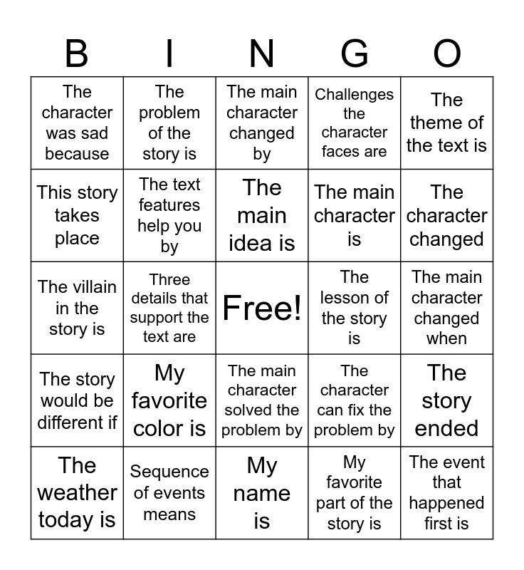 This bingo card has a free space and 25 words: My favorite color is, My name is, The main idea is, The weather today is, The theme of the text is, The character was sad because, This story takes place, The problem of the story is, The lesson of the story is, The main character solved the problem by, The main character is, The villain in the story is, The character can fix the problem by, The story ended, The text features help you by, The glossary is, The main character changed when, The main character changed by, The character changed, Three details that support the text are, The event that happened first is, Sequence of events means, The story would be different if, Challenges the character faces are and My favorite part of the story is.