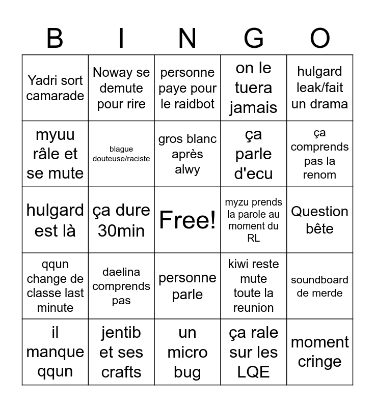 This bingo card has a free space and 24 words: daelina comprends pas, jentib et ses crafts, gros blanc après alwy, il manque qqun, hulgard leak/fait un drama, Yadri sort camarade, myuu râle et se mute, Noway se demute pour rire, myzu prends la parole au moment du RL, personne parle, ça parle d'ecu, hulgard est là, kiwi reste mute toute la reunion, soundboard de merde, blague douteuse/raciste, ça rale sur les LQE, Question bête, personne paye pour le raidbot, ça comprends pas la renom, ça dure 30min, moment cringe, qqun change de classe last minute, on le tuera jamais and un micro bug.