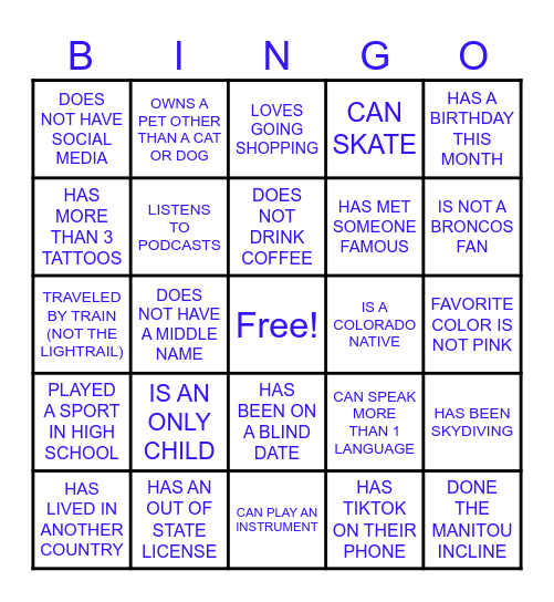 This bingo card has a free space and 24 words: IS AN ONLY CHILD, HAS AN OUT OF STATE LICENSE, DOES NOT DRINK COFFEE, HAS LIVED IN ANOTHER COUNTRY, HAS A BIRTHDAY THIS MONTH, DOES NOT HAVE SOCIAL MEDIA, HAS MORE THAN 3 TATTOOS, OWNS A PET OTHER THAN A CAT OR DOG, IS A COLORADO NATIVE, HAS BEEN ON A BLIND DATE, HAS MET SOMEONE FAMOUS, TRAVELED BY TRAIN (NOT THE LIGHTRAIL), CAN SPEAK MORE THAN 1 LANGUAGE, HAS BEEN SKYDIVING, LISTENS TO PODCASTS, HAS TIKTOK ON THEIR PHONE, FAVORITE COLOR IS NOT PINK, LOVES GOING SHOPPING, IS NOT A BRONCOS FAN, DOES NOT HAVE A MIDDLE NAME, DONE THE MANITOU INCLINE, PLAYED A SPORT IN HIGH SCHOOL, CAN SKATE and CAN PLAY AN INSTRUMENT.