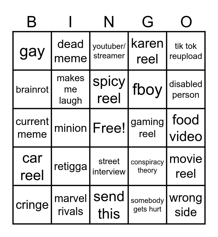 This bingo card has a free space and 24 words: cringe, retigga, spicy reel, somebody gets hurt, tik tok reupload, gay, dead meme, youtuber/ streamer, gaming reel, food video, current meme, makes me laugh, conspiracy theory, movie reel, brainrot, marvel rivals, send this, karen reel, disabled person, car reel, minion, street interview, fboy and wrong side.