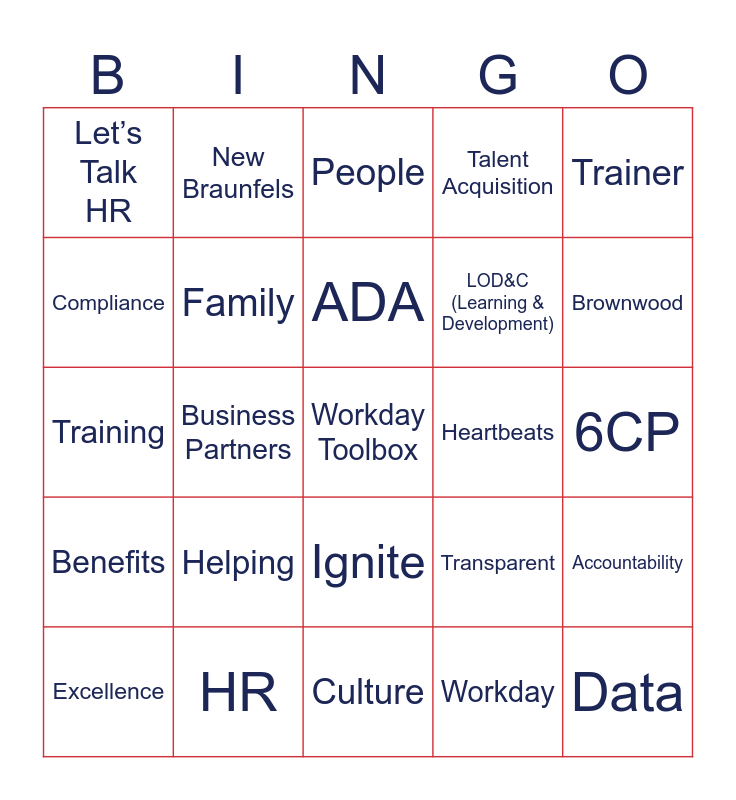 This bingo card has 59 words: Free!, HR, Wellness Fair, Benefits, Workday, Engagement, Family, New Employees, LOD&C (Learning & Development), Shared Services, Talent Acquisition, Service, Compliance, Payroll, 1HR4U, Let’s Talk HR, Workday Toolbox, Trainer, Title IX, ADA, Heartbeats, People, Excellence, Accountability, Integrity, Waco, Harlingen, Abilene, Brownwood, Breckenridge, Sweetwater, North Texas, Marshall, EWCHEC, New Braunfels, Fort Bend, Analysts, Business Partners, Leadership, Training, Facilitating, Helping, 6CP, Shared Services, Innovative, Collaborate, Compelling, Family, Ignite, Culture, Supportive, Empowering, Dynamic, Branding, Care, Transparent, Let’s Talk!, Data and Growth.