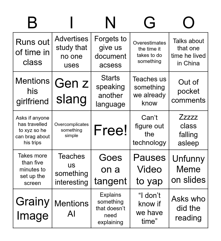This bingo card has a free space and 38 words: Monty Python reference, Says we have a progress check - We do not have one, Slideshow with no useful information on it, Gen z slang, Unfunny Meme on slides, Teaches us something interesting, Starts speaking another language, “I’ve actually been there”, Talks about that one time he lived in China, Teaches us something we already know, Overcomplicates something simple, Overestimates the time it takes to do something, Asks who did the reading, Zzzzz class falling asleep, Mentions his girlfriend, Takes more than five minutes to set up the screen, Teaches us something that’s common sense, Forgets to give us document acsess, *crickets*, Can’t figure out the technology, Runs out of time in class, Mentions AI, Out of pocket comments, Grainy Image, Random “funny” video, Explains something that doesn’t need explaining, Wears his 12 year old boy hoodie, “This will be on the exam”, Practice Question no one does, Looks to us to answer question when the class is silent, Mentions Kahoot, Goes on a tangent, “I don’t know if we have time”, Advertises study that no one uses, “You guys do this on your own”, Pauses Video to yap, Asks if anyone has travelled to xyz so he can brag about his trips and “This won’t take long”.