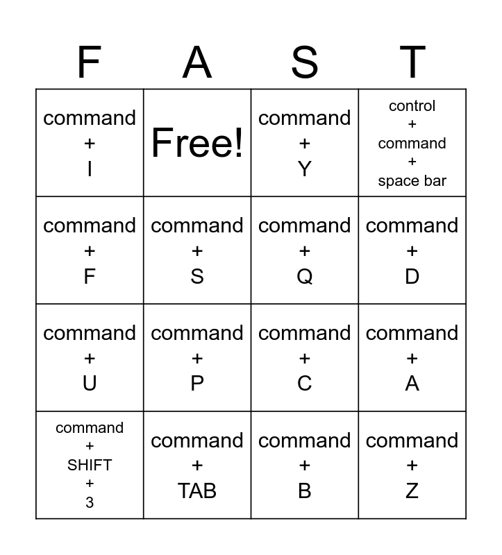 This bingo card has 19 words: command + C, command + V, command + Y, command + Z, command + A, command + F, command + B, command + I, Free!, command + U, command + P, command + S, command + Q, command + TAB, command + SHIFT + 3, command + SHIFT + 4, control + command + space bar, command + D and command + T.