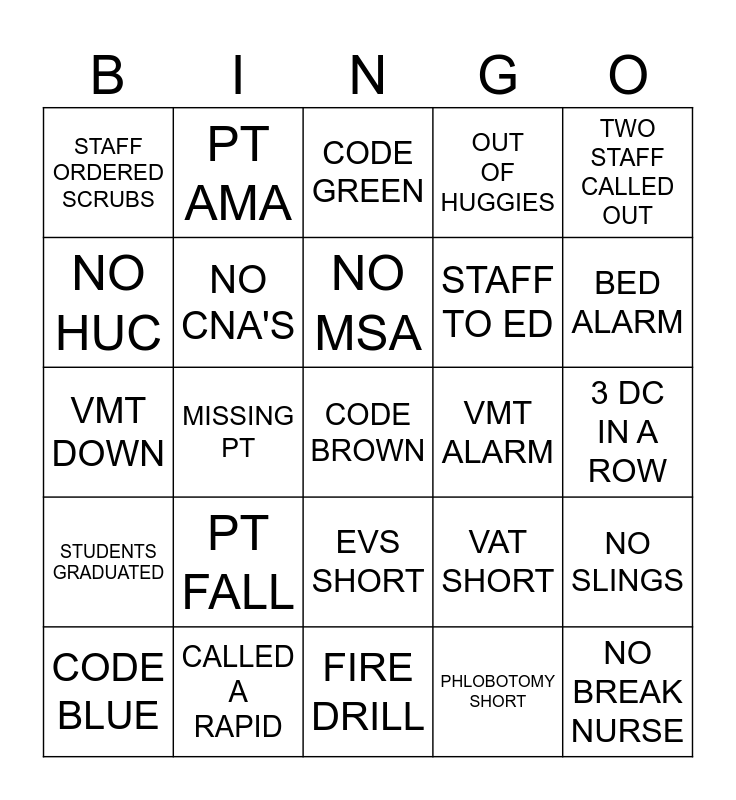 This bingo card has a free space and 24 words: PT FALL, CALLED A RAPID, NO MSA, CODE BLUE, TWO STAFF CALLED OUT, STAFF ORDERED SCRUBS, NO HUC, PT AMA, VMT ALARM, EVS SHORT, STAFF TO ED, VMT DOWN, VAT SHORT, NO SLINGS, NO CNA'S, PHLOBOTOMY SHORT, 3 DC IN A ROW, CODE GREEN, BED ALARM, MISSING PT, NO BREAK NURSE, STUDENTS GRADUATED, OUT OF HUGGIES and FIRE DRILL.