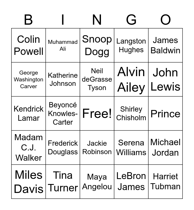 This bingo card has a free space and 49 words: Martin Luther King Jr., Harriet Tubman, Barack Obama, Maya Angelou, Frederick Douglass, Rosa Parks, Muhammad Ali, Ice Cube, George Washington Carver, Thurgood Marshall, Katherine Johnson, Langston Hughes, Michael Jordan, Serena Williams, W.E.B. Du Bois, Toni Morrison, Neil deGrasse Tyson, Shirley Chisholm, Mae Jemison, James Baldwin, Beyoncé Knowles-Carter, LeBron James, Colin Powell, Alvin Ailey, Aretha Franklin, John Lewis, Miles Davis, Benjamin Banneker, Jackie Robinson, Madam C.J. Walker, Louis Armstrong, Marian Anderson, Coretta Scott King, Ida B. Wells, Tina Turner, Nina Simone, Michael Jackson, Bob Marley, Prince, Stevie Wonder, Robert Johnson, Louis Armstrong, Tupac Shakur, 50 Cent, Kendrick Lamar, Snoop Dogg, Nipsey Hussle, Akon and Quincy Jones.