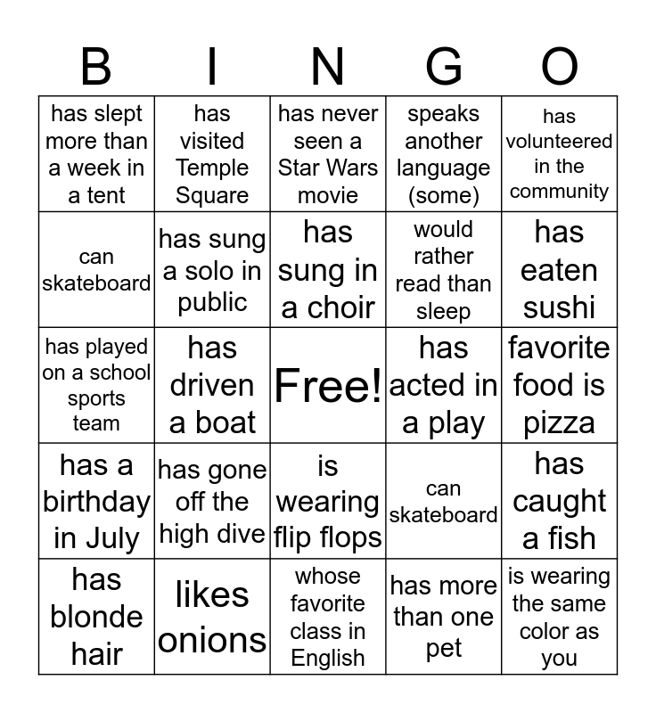 This bingo card has a free space and 24 words: has gone off the high dive, likes onions, has sung in a choir, has blonde hair, has volunteered in the community, has slept more than a week in a tent, can skateboard, has visited Temple Square, has acted in a play, is wearing flip flops, would rather read than sleep, has played on a school sports team, can skateboard, has caught a fish, has sung a solo in public, has more than one pet, favorite food is pizza, has never seen a Star Wars movie, has eaten sushi, has driven a boat, is wearing the same color as you, has a birthday in July, speaks another language (some) and whose favorite class in English.